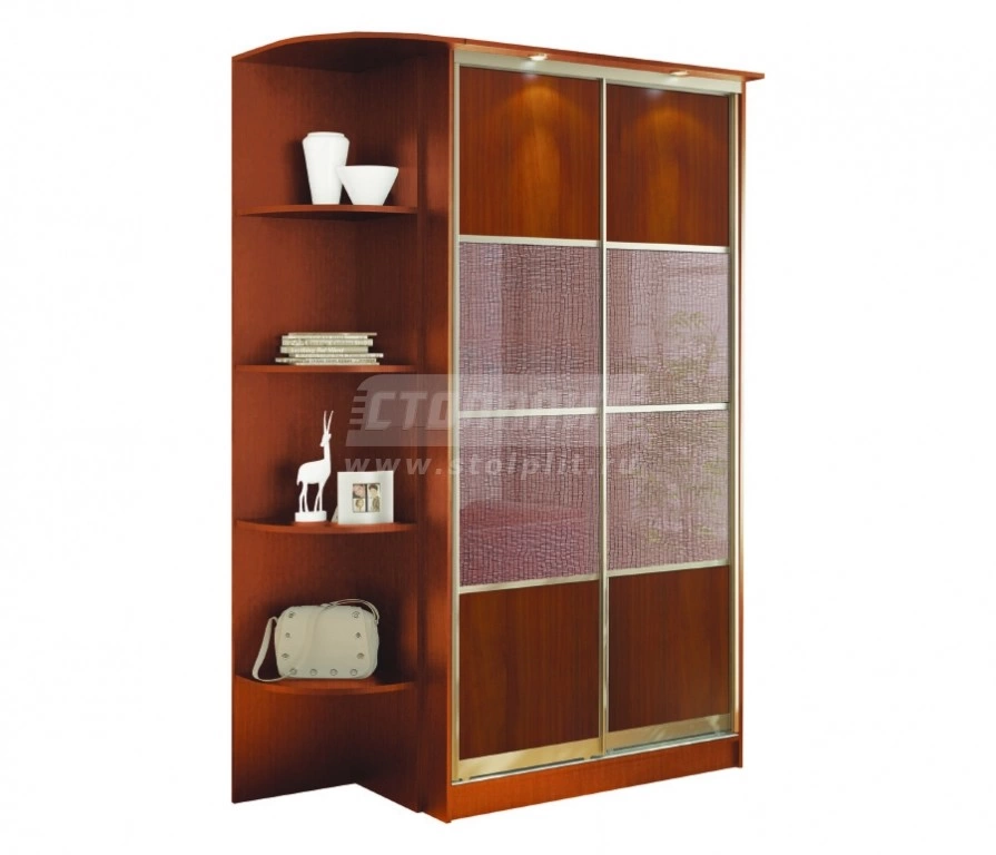 Шкаф 2-х дверный «СБ-1082БП» воплощает в себе сочетание комфорта и изящества. Данная модель обладает большой вместительностью: кроме закрытых секций присутствует торцевой пенал с четырьмя открытыми полками. Шкаф оборудован стеклянным фасадом с нежным рисунком, а также имеет верхнюю подсветку. Шкаф выполнен в актуальном цвете «Яблоня локарно».