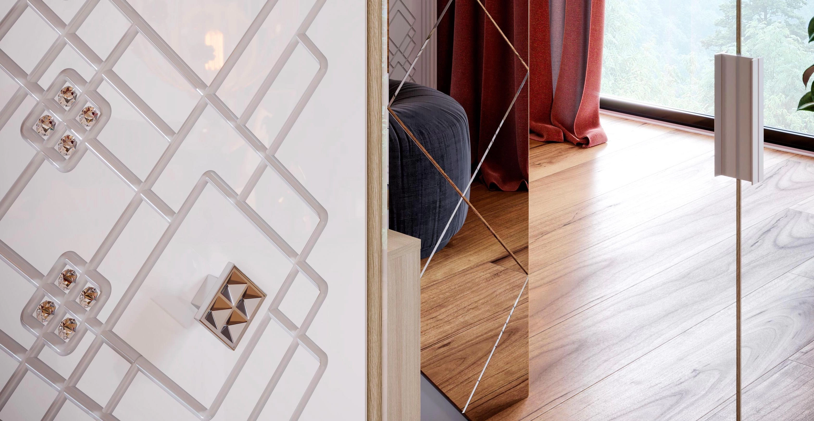 - Фасад модульной спальни выполнен из МДФ облицованного пленкой ПВХ Белый глянец.
